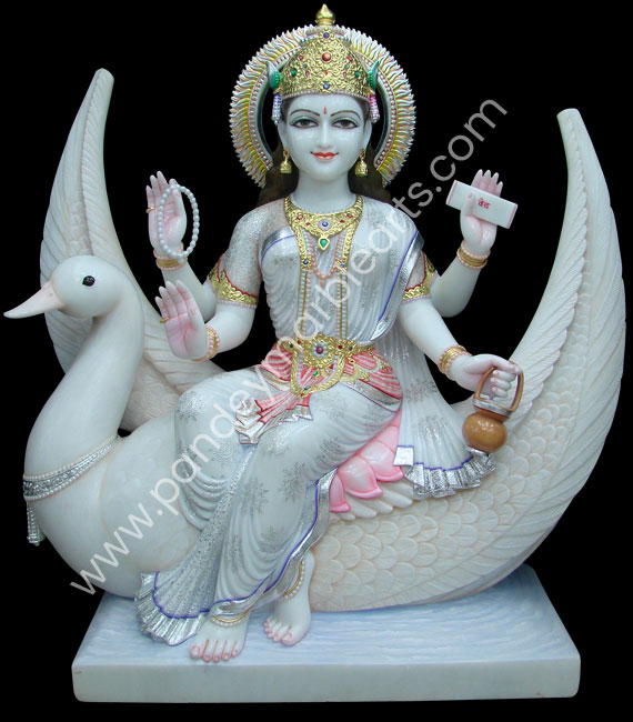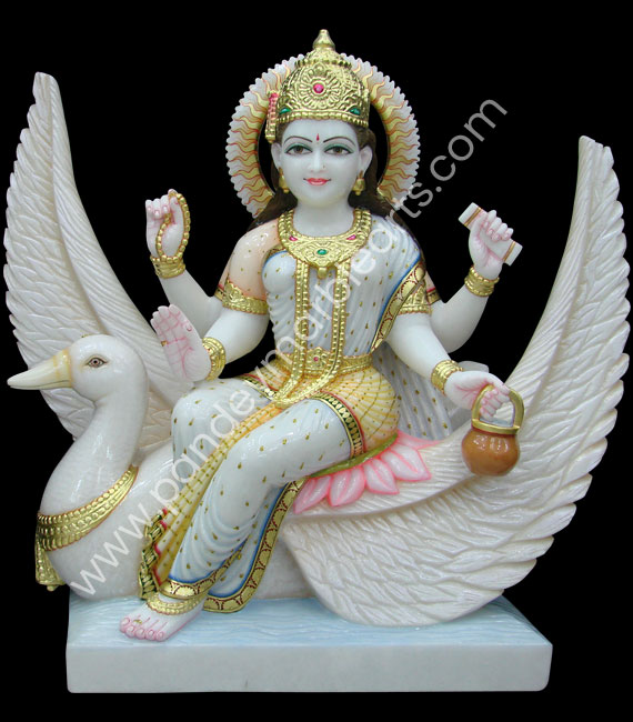 Brahmani Mata is a relatively new goddess in the Hindu pantheon. She is one of the seven mother goddesses called Matrikas. She is a form of Saraswati and is considered as the Shakti of the creator god Brahma in Hinduism. She is depicted in white colorful marble and with four hands. She holds lotus, vedas and trident in her hand and is seated on white swan as her vahana. She wears various ornaments and basket shaped crowns.